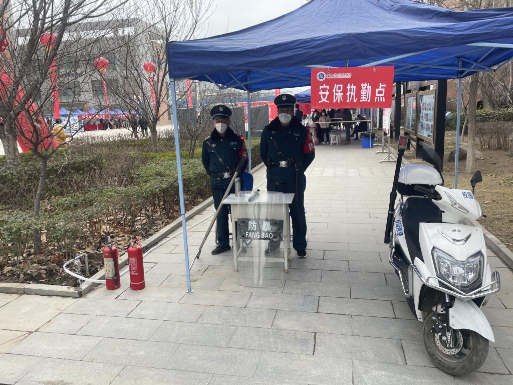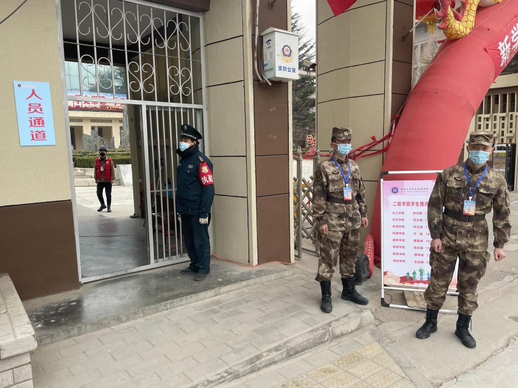 学生返校前,保卫处提前与驻地公安、交警部门报备协调,请求警力支援,于2月22日召开工作动员会,传达学校相关指示和安排,进行了明确的分工和具体的任务分配;联合学工处、后勤处等部门,搭建帐篷、进行测温枪调试等工作。