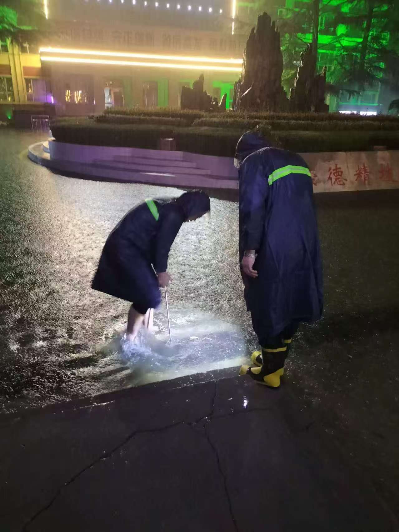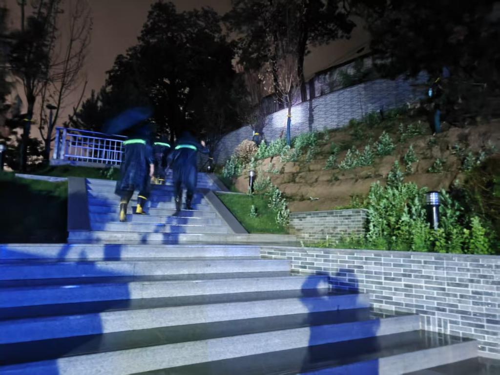 当晚,保卫处和后勤管理处工作人员迅速到位,组建防汛应急小组,对校园进行全面巡查,并对出现的隐情及时向胡院长汇报,他们重点检查了地势低洼区域、排水管道、电力设施以及护坡、公寓周边等重点部位,及时发现并处理了多处安全隐患。在巡查过程中发现,学校正门口及图书馆北侧排水管道出现堵塞,积水迅速蔓延。应急小组立即展开行动,清理管道内的杂物,确保排水畅通。